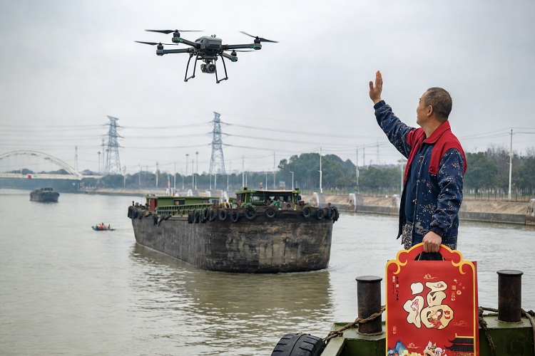 2月5日,一架悬挂红色礼袋的无人机从前黄船闸平稳起飞,精准飞向正在引航道准备过闸的货船。在农历新年临近之际,常州市船闸管理中心创新试点无人机向过闸船舶配送“福袋”,为水上奔波的船民送去了一份科技感十足的年味温暖。 与传统广播、挥手问候方式不同,此次无人机送“福”是“智慧船闸”与“温情服务”融合的新尝试。现场,工作人员将精心卷扎的“福”字系于改装后的无人机下方,操作员精准操控其飞临目标船舶安全高度,通过缓降悬停、自动释放,将祝福稳稳送达船民手中。整个过程平稳高效,全程避让船舶设施,确保通航安全。 此次试运行不仅是为传递新春祝福,更是对复杂通航环境下无人机精准、安全投送能力的一次实战检验,为今后开展救援物资传递、应急药品投送等作业积累经验。未来,常州市船闸管理中心将持续优化此项服务,让船民在享受高效通航的同时,感受到更多来自船闸的关怀与温暖。