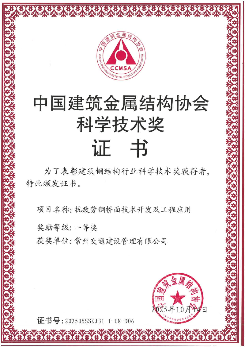 近日,从2025年中国建筑金属结构协会建筑钢结构科技创新大会上传来喜讯——常州交通建设管理有限公司主导的中吴大道西延智慧快速路工程(一期)项目科研成果《抗疲劳钢桥面技术开发及工程应用》荣获科学技术奖一等奖。