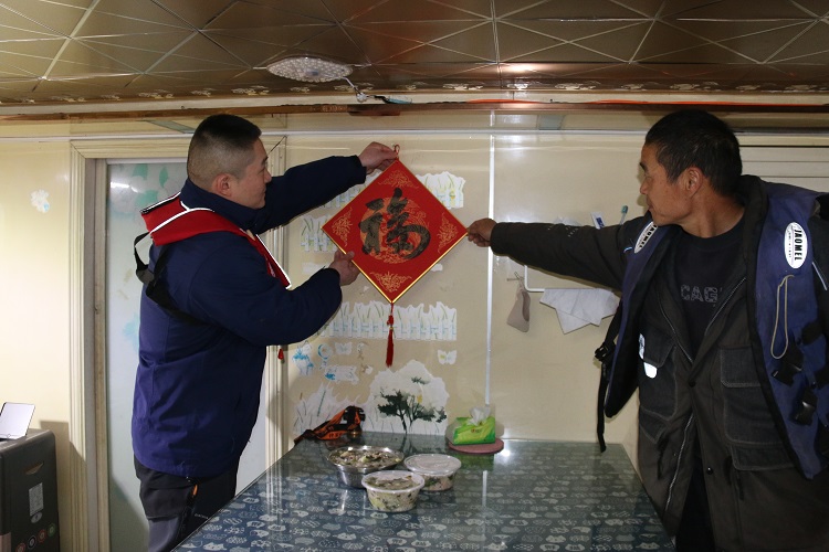 船闸职工登上船舶,给船民热情递出粥品,声声祝福传递暖意。与此同时,前黄船闸的书法爱好者现场挥毫,笔墨间跃出一幅幅吉祥“福”字,“要贴船头讨彩头”“想挂船舱添福气”的声音此起彼伏,现场满是欢声笑语。